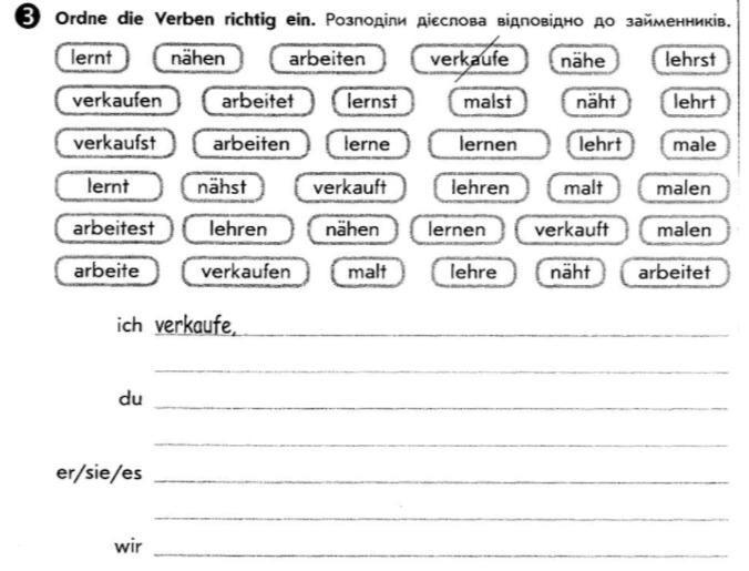 er/sie/es: lernt, arbeitet, näht, lehrt, lernt, verkauft, malt, verkauft, malt, näht