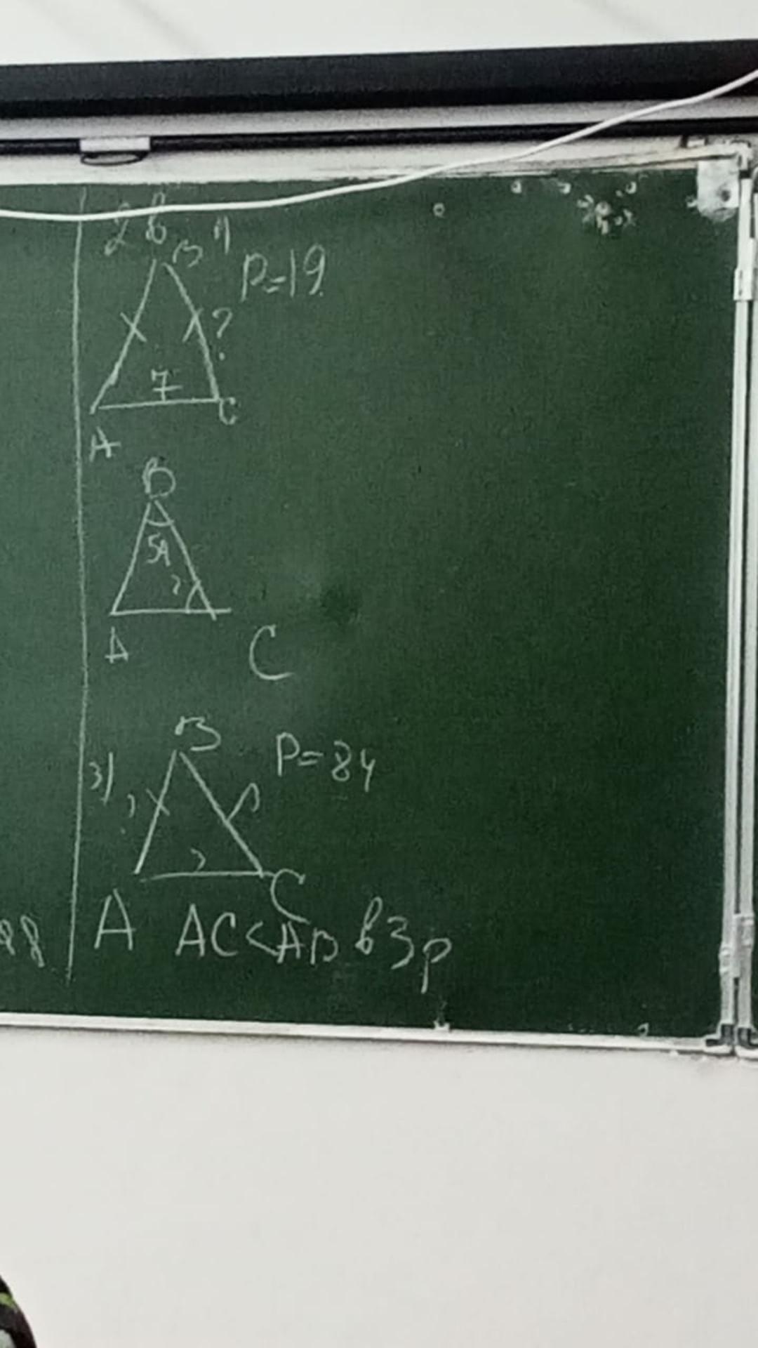 2. P = 2*BC + AC 19 = 2*BC+7 2BC=19-7 2BC=12 BC= 6 т. к. AB=BC