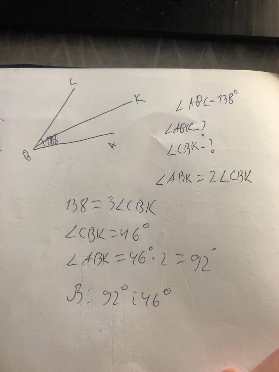 Промінь BK проходить між сторонами кута ABC, ABC 138 градусів. Знайдіть градусну міру кута ABK і кута CBK якщо ABK більший за кут CBK у 2 рази