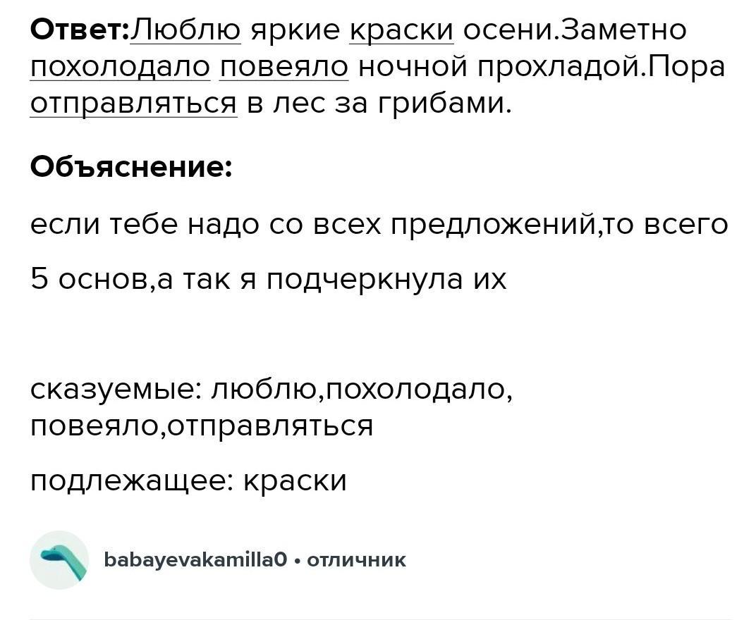 Определи, из скольких главных членов состоит грамматическая основа этих предложений.Заметно похолодало.Повеяло ночной прохладой.Пора отправляться в лес за грибами.Люблю яркие краски осени.