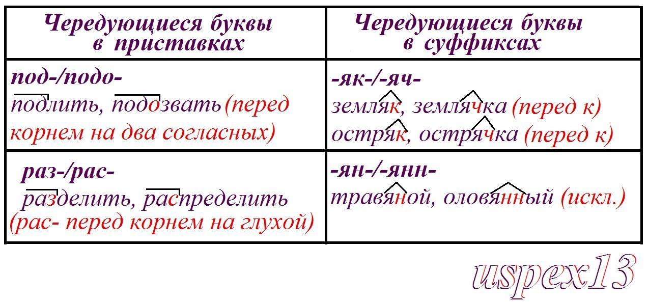 Даны слова: подозвать, земляк, оловянный, остряк, разделить, травяной, подлить. Разделить эти слова на 2 столбика (сделать таблицу): 1) слова с чередующимся суффиксом (варианта суффикса) 2) слова с чередующейся приставкой. В таблице объяснить свой выбор