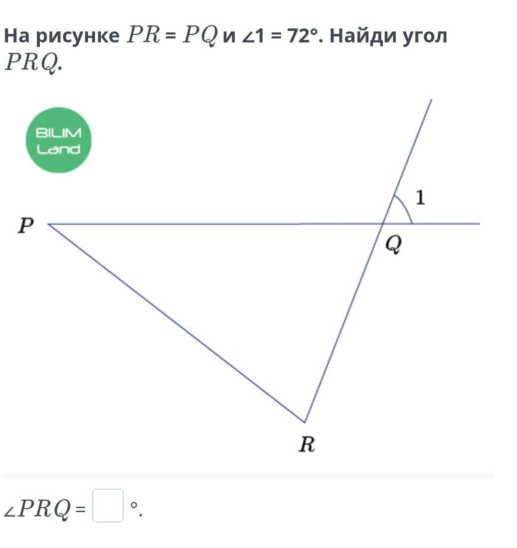 По условию задачи треугольник равнобедренный. угол PQR= PRQ. угол PQR= углу 1= 72°( как вертикальные)