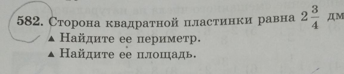 582. Сторона квадратной пластинки равна 2 3/4дм. A Найдите ее периметр. A Найдите ее площадь.