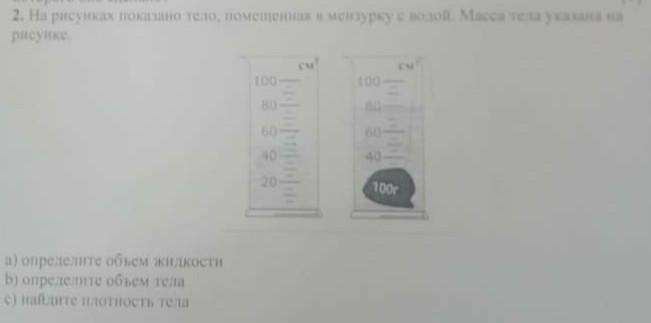 знайти різницю двох мензурок, це і буде об'єм тіла: