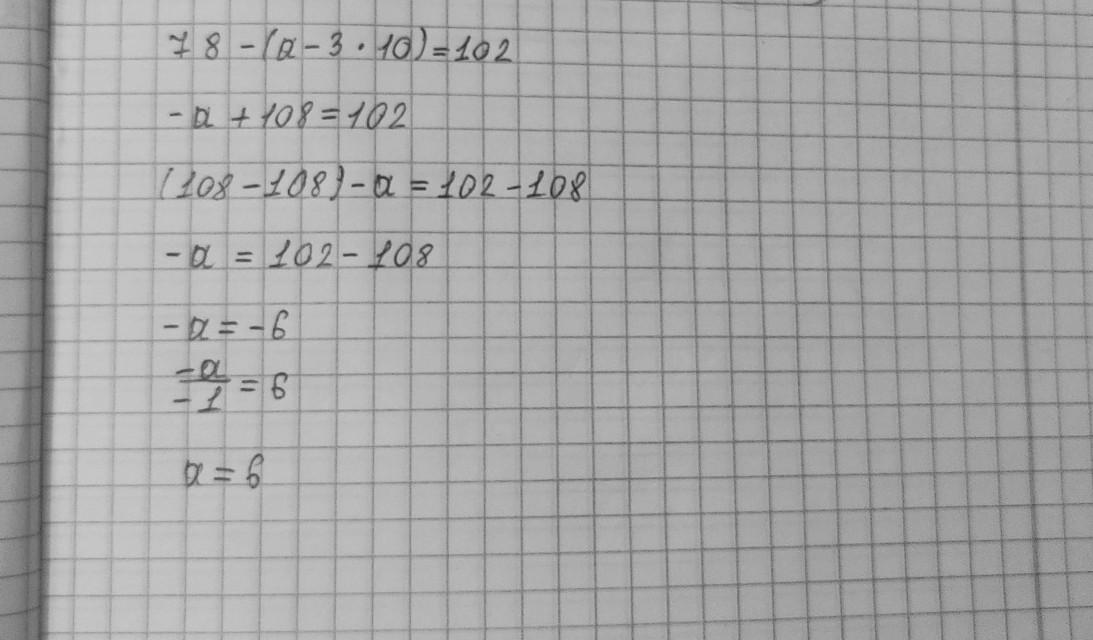 Какое число надо подставить вместо a, чтобы корнем уравнения 78−(a−3x)=102 было число 10.