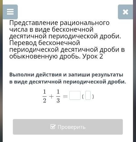 Представление рационального числа в виде бесконечной десятичной периодической дроби. Перевод бесконечной периодической десятичной дроби в обыкновенную дробь. Урок 2 Выполни действия и запиши результаты в виде десятичной периодической дроби. 1/2+1/3=( )
