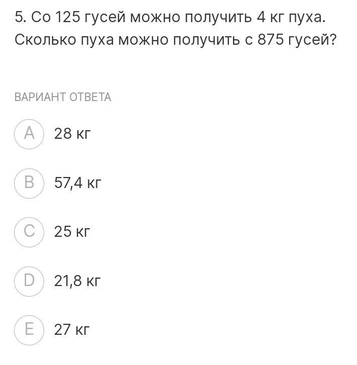 Следущим действием мы находим сколько получится кг пуха с 875 гусей