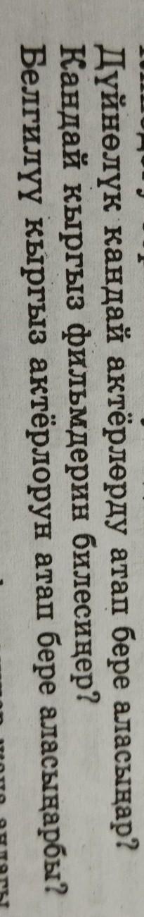 Дүйнөлүк кандай актёрлорду атап бере аласыңар? Кандай кыргыз фильмдерин билесиңер? Белгилүү кыргыз актёрлорун атап бере аласыңарбы?