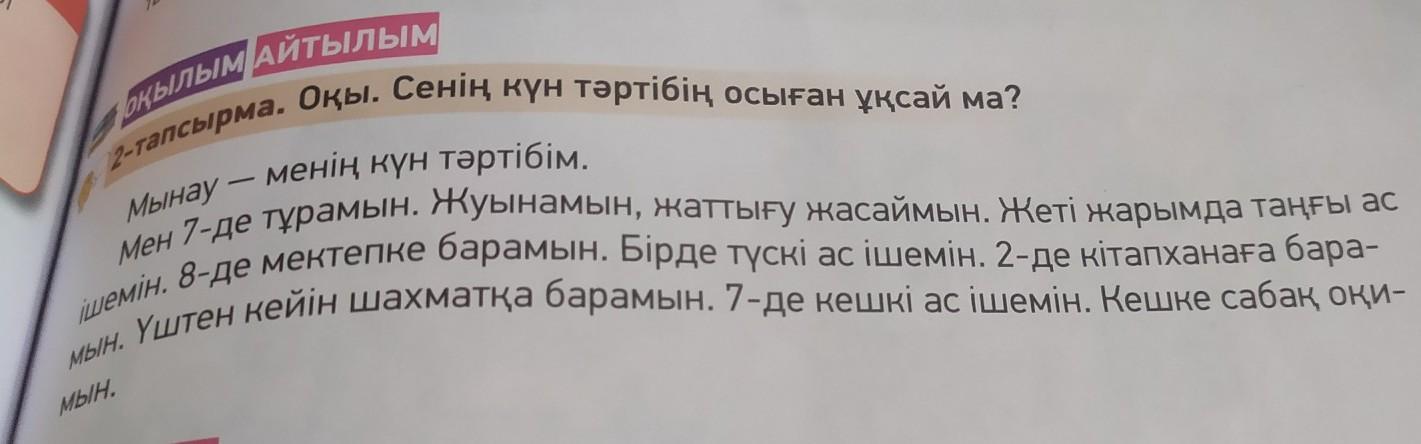 ЖАЗЫЛЫМ 4-тапсырма. 2-тапсырмаға қарап, өз күн тәртібіңді жаз. помогите пж дам20 балов