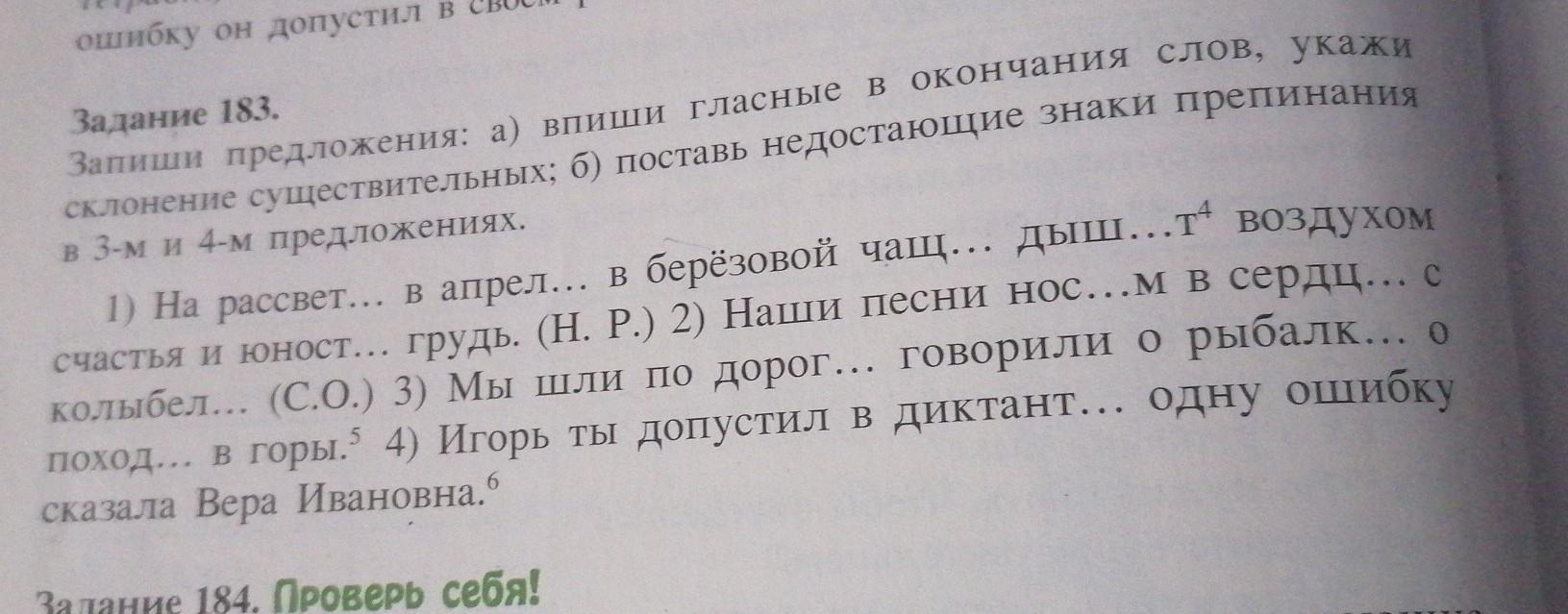 1). На рассвете(2склон.) в апреле(2) в берёзовой роще(1) дышит воздухом(2) счастья(2) и юности(3) грудь(3). 2). Наши песни(1) носим в сердце(2) с колыбели(3). 3). Мы шли по дороге(1), говорили о рыбалке(1), о походе(2) в горы(1). 4). "Игорь, ты допустил в диктанте(2) одну ошибку(1)" - сказала Вера Ивановна.