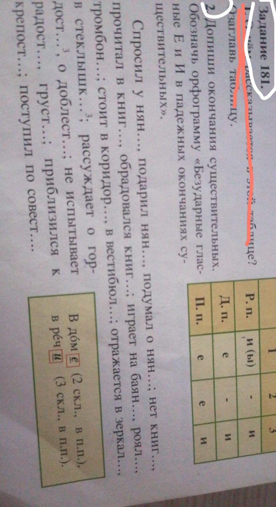 Спросил у нянИ ( 1 скл., Р.п ), подарил нянЕ ( 1 скл., Д.п ), подумал о нянЕ ( 1 скл., П.п ), нет книгИ ( 1 скл., Р.п ), прочитал в книгЕ ( 1 скл., П.п ), обрадовался книгЕ ( 1 скл., Д.п ), играет на баянЕ ( 2 скл., П.п ), роялЕ ( 2 скл., П.п ), тромбонЕ ( 2 скл., П.п ), стоит в коридорЕ ( 2 скл., П.п ), в вестибюлЕ ( 2 скл., П.п ), отражается в зеркалЕ ( 2 скл., П.п ), в стёклышкЕ ( 2 скл., П.п ), рассуждает о гордостИ ( 3 скл ), о доблестИ ( 3 скл ), не испытывает радостИ ( 3 скл ), грустИ ( 3 скл ), приблизился к крепостИ ( 3 скл ), поступил по совестИ ( 3 скл ).