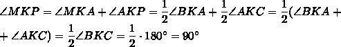 углы MKA и AKP по условию равны половинам углов BKA и AKC. Тогда