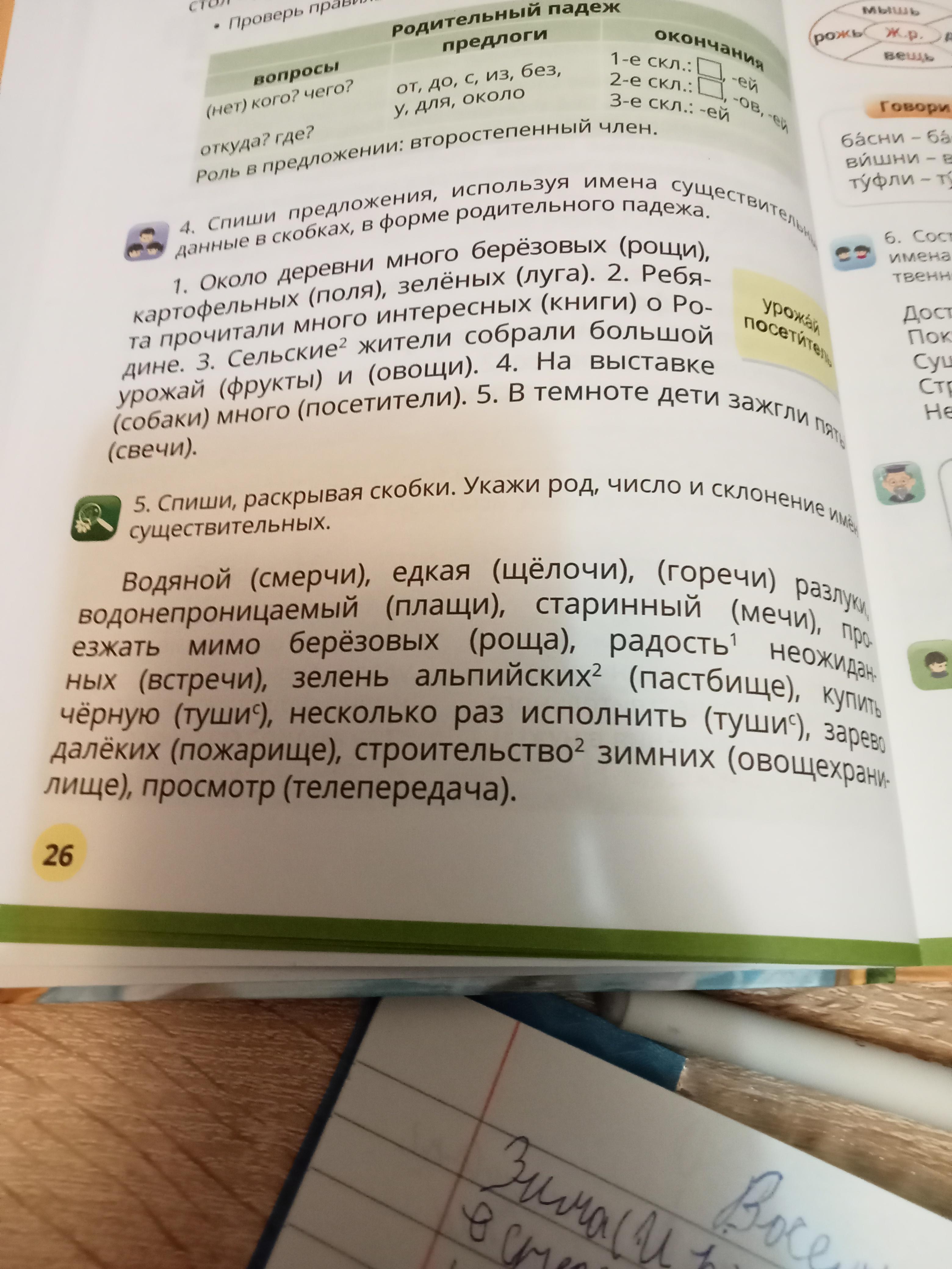 5. Спиши рассказывая скобки укажи род число и склонение имён существительных