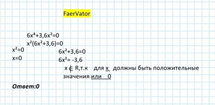 Для нахождения решения уравнения 6x^4 + 3.6x^2 = 0 мы применим метод разложения на множители выражения в левой части уравнения.