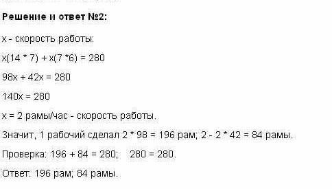 Двое рабочих изготовили вместе 280 оконных рам. Один из них работал 14 дней по 7 часов в день, а другой работал 7 дней по 6 часов в день.Сколько рам изготовил каждый из них, если они за 1 час работы изготавливали одинаковое число рам? (Решите с иксом)