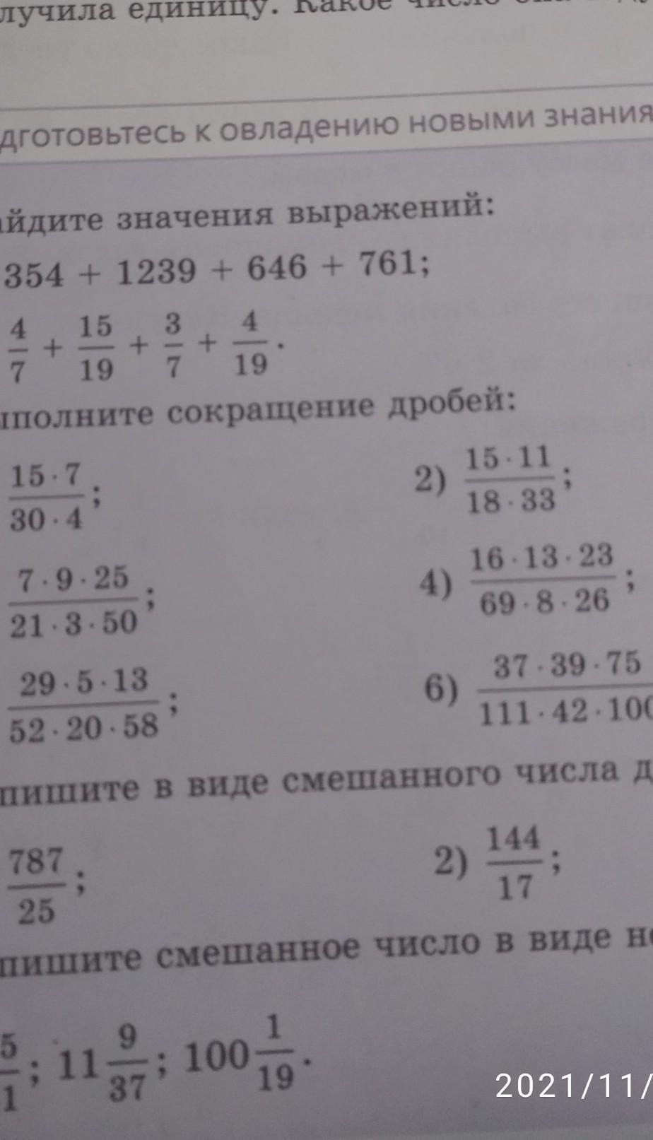 15=5×3 тоесть 5×3×7\5×6×4 убираем одинаковые вот убираем пятерки тоесть смотрим какие тут есть у меня есть пятерки в числителях и знаменательных убираем их 1)ответ: 21/24 2)7×3×3×5×5/7×3×3×5×5×2 убираем тройки и пятерки 2)ответ:0/2 или 2 3)29×5×13/2×2×13×5×3×2×2×29 3)=48 4)5×3×11/9×2×3×11= 4=5/18 5)4×2×2×13×23/23×3×4×2×13×2 5=0/3 =3. 6)37×13×3×5×5×3/11×5×2×7×3×7×3×5×4×5 6)=481/21560