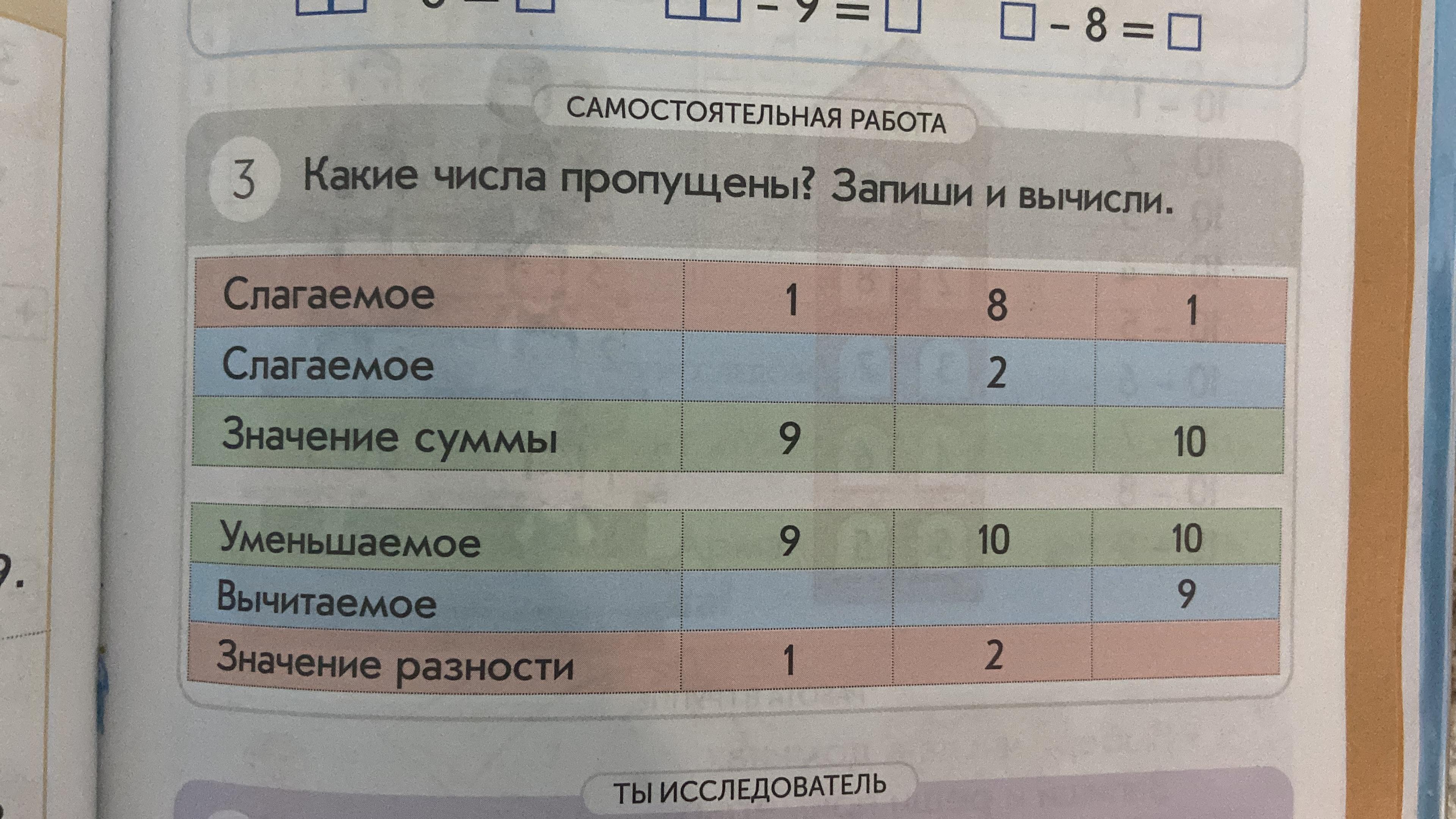 слагаемое и значение суми слева на право 8, 10, 9. вычитаение и знач. разности слева на право 8,8,1