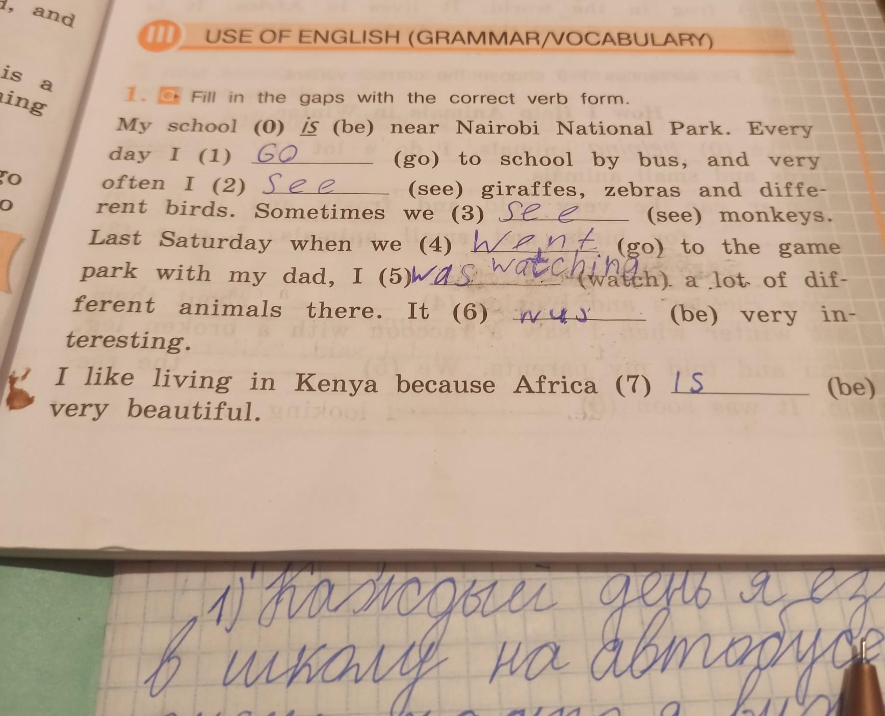 Моя школа находится рядом с Национальным Парком Наироби. Каждый день я езжу в школу на автобусе, и очень часто я вижу жирафов, зебр и разных птиц. Иногда я вижу обезьян. В прошлое воскресенье, когда мы пришли/приехали на игру в парке с моим папой, я наблюдала за множеством разных животных здесь. Это было очень интересно.