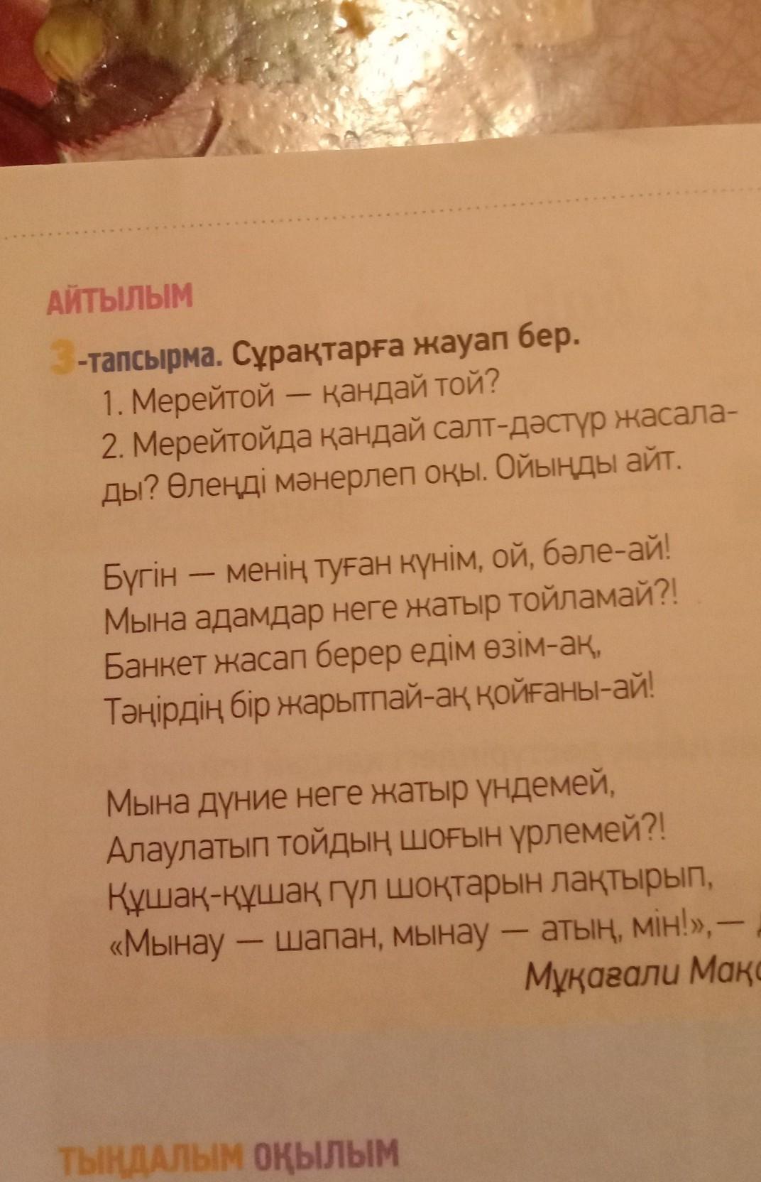 ЖАЗЫЛЫМ 5-тапсырма. Өлең мәтінінен бейтаныс сөздерді тауып, сөздік жұмысын жаса. Сездікке сүйеніп, өлеңнің мазмұнын қара сөзбен айт. Шартты райлы етістіктерді қолдан. Үлгі: Бір тойым болса, ешкімді билетпей қайтармаймын. Қарттар да бір ән салмаа, үйіне қайтпайды.
