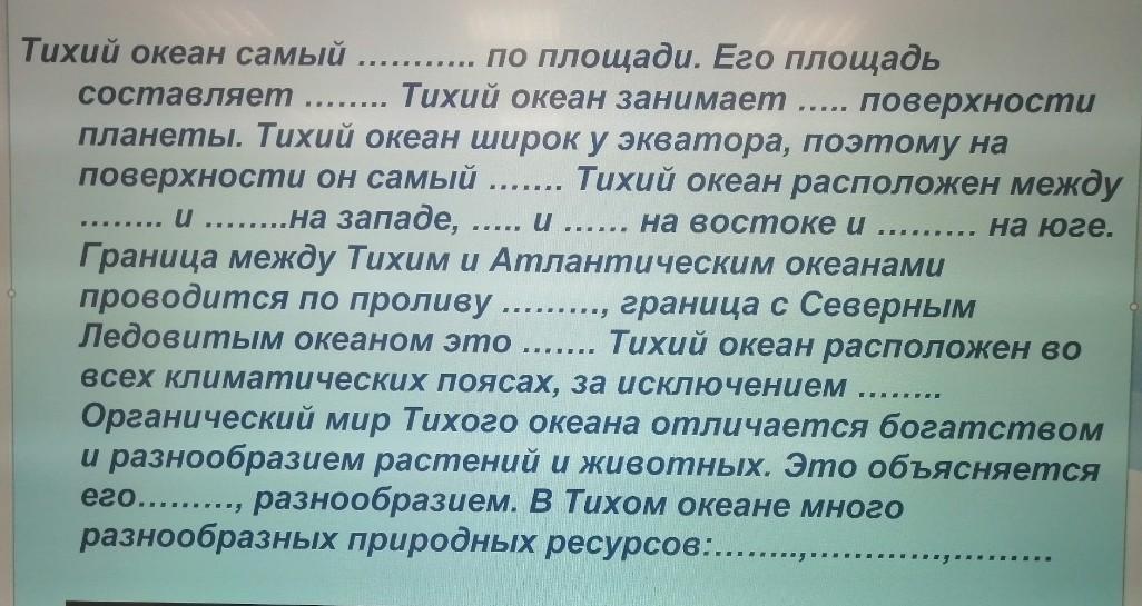 Тихий океан большой по площади. Его площадь составляет 178684000 км2. Тихий океан занимает 49,5% поверхности планеты.