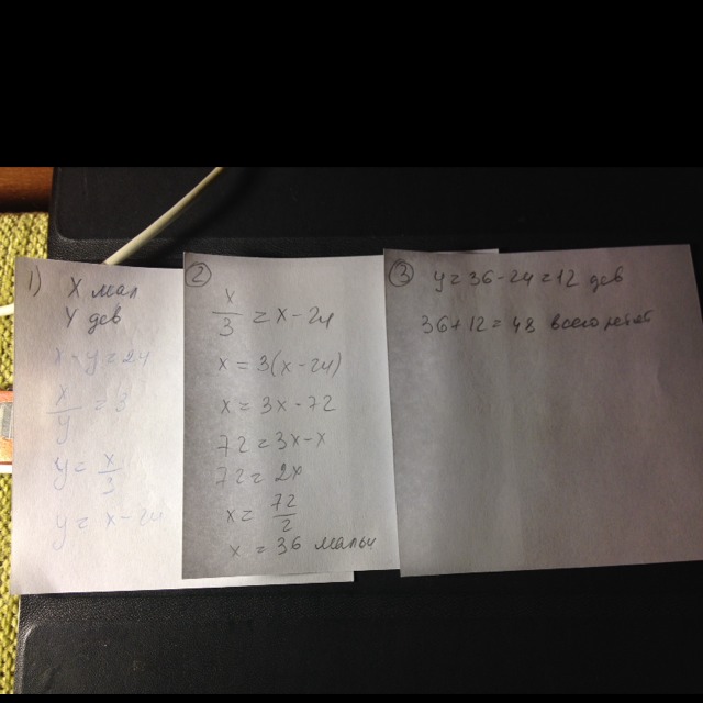 В шахматном кружке девочек на 24 человека,меньше чем мальчиков.Сколько ребят занимается в кружке,если девочек в три раза меньше,чем мальчиков?