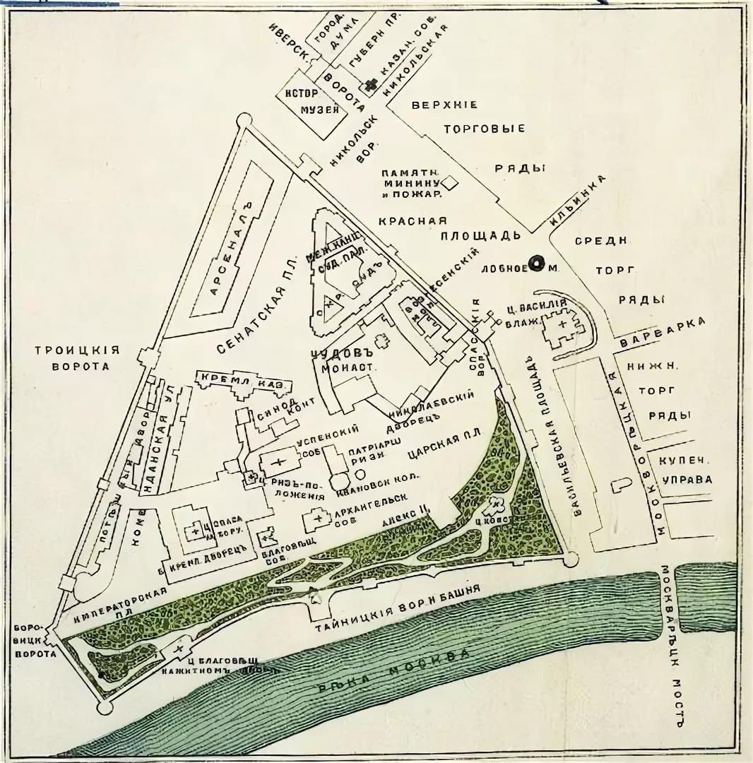 1) На всем своем протяжении Александровские сады примыкают одной стороной к стенам и башням Кремля: Верхний сад — к Большой Арсенальной, или Собакиной, башне, Средней Арсенальной и Троицкой с мостом и Кутафьей-башней в начале его; Средний сад — к Троицкой, Комендантской, Оружейной и Боровицкой башням; Нижний сад — к Боровицкой и Водовзводной башням.