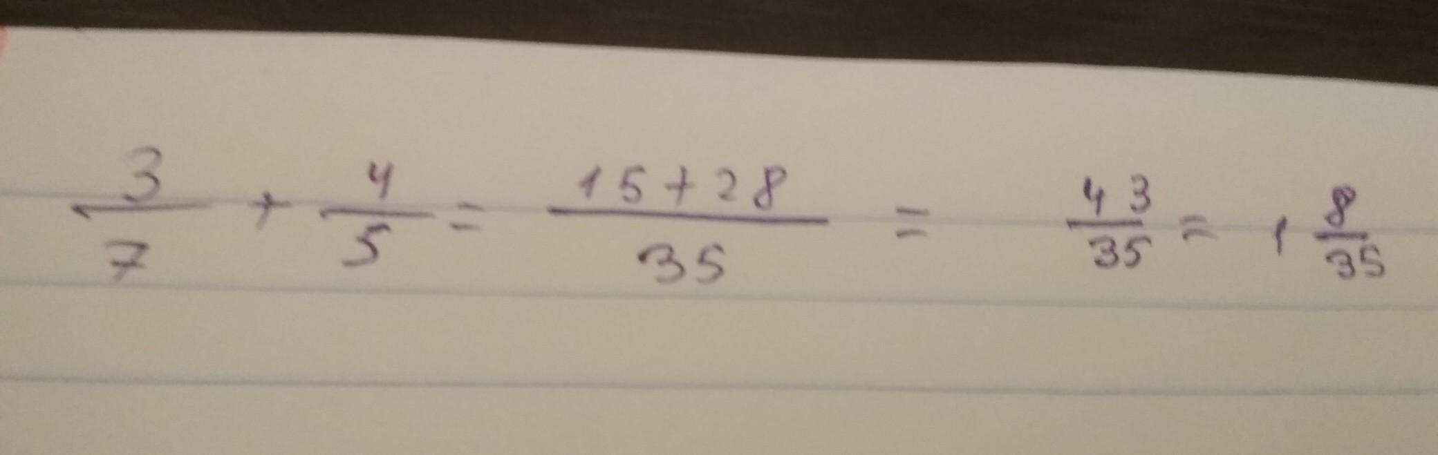 3/7+4/5= 15/35+28/35=43/35