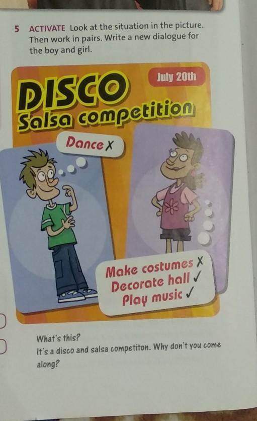 5 ACTIVATE Look at the situation in the picture. Then work in pairs. Write a new dialogue for the boy and girl. July 20th DISCO Salsa competition Dance x Make costumes X Decorate hall ✓ Play music What's this? It's a disco and salsa competiton. Why don't you come along?«Please help!»