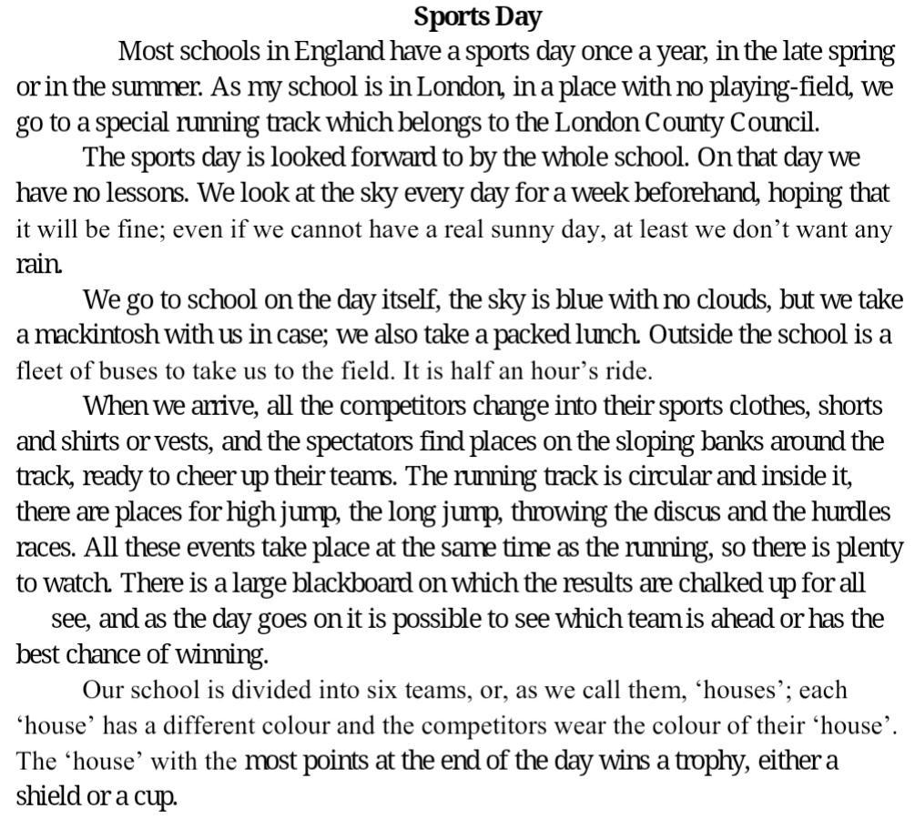 Будь ласка дайте відповідь на ці запитання, плачу 20 балів, текст нище : 1. Where do the students go when they haven't any playing-field? 2. When do most schools have a sports day? 3. How much time does it take them to get to the playing-field? 4. Do the competitors have special sports clothes? 5. Is there a large blackboard with the results of the competition? 6. What do the competitors win?