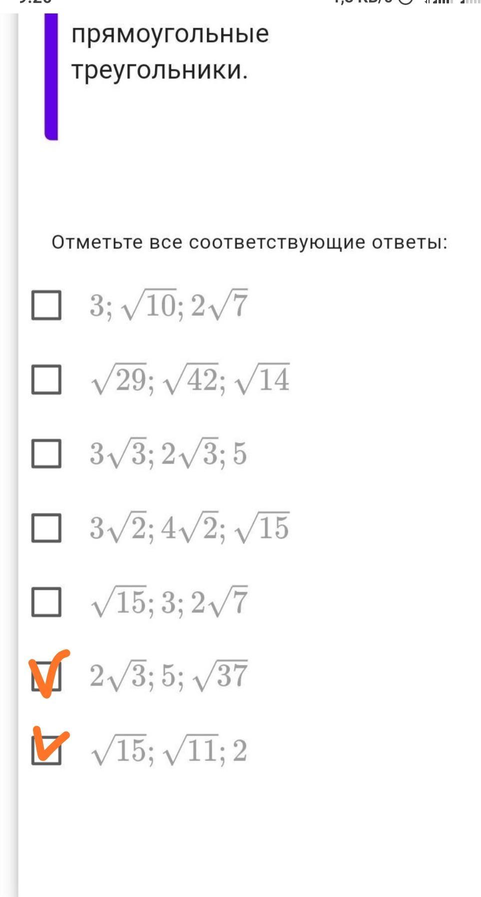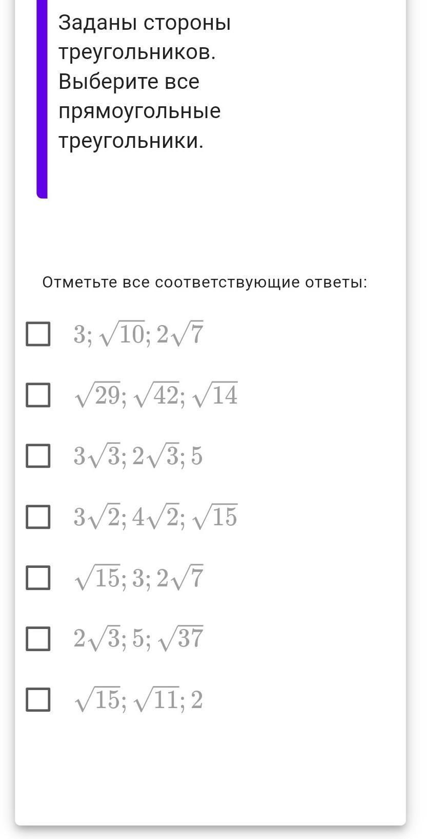 Прямоугольными треугольниками являются треугольник со сторонами: