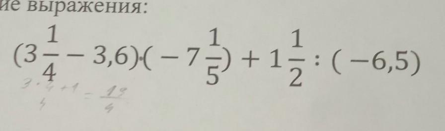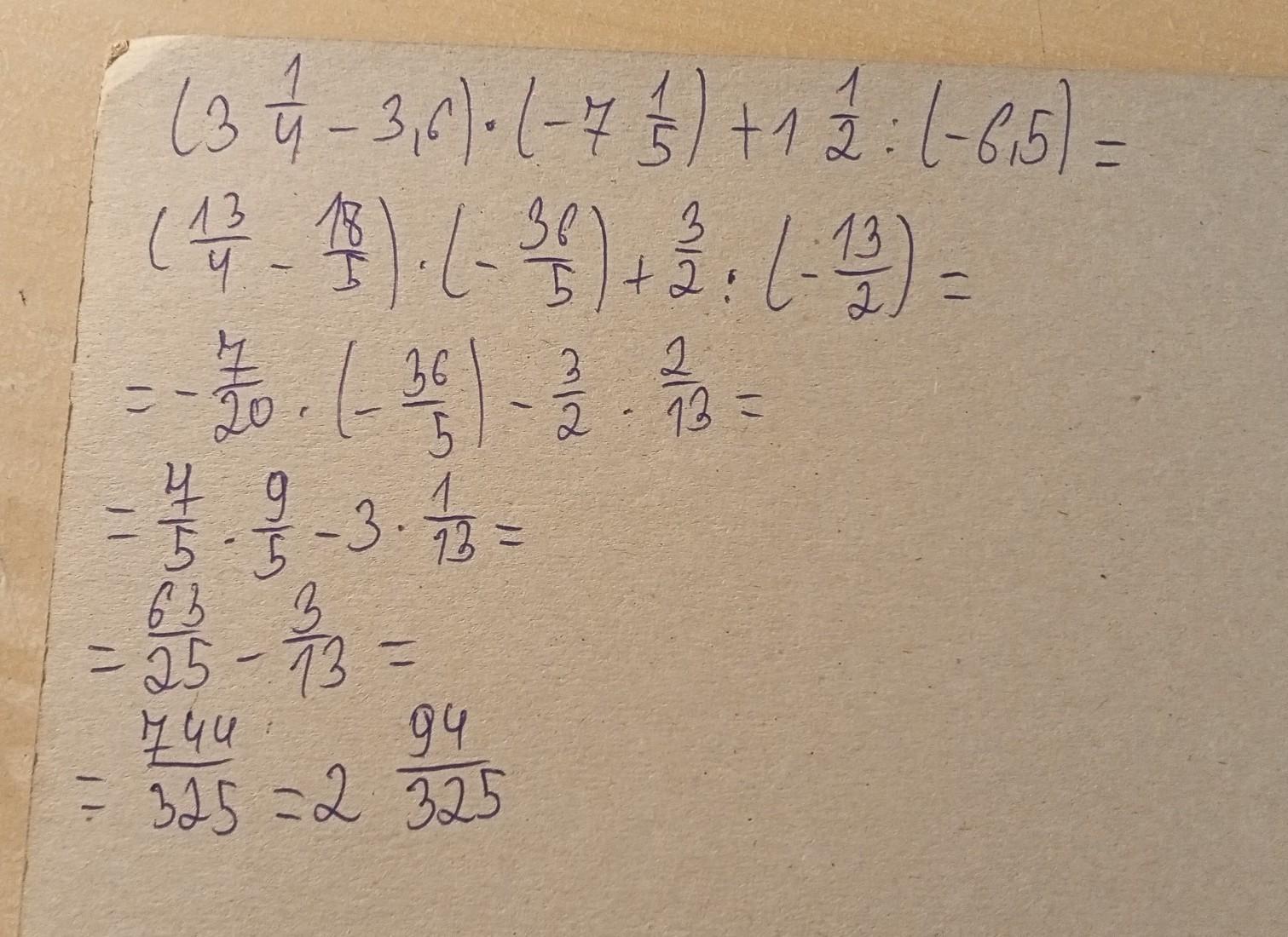 ( 3 1/4 - 3,6 )*(- 7 1/5 ) +1 1/2 : (- 6,5 ) = 2 94/325