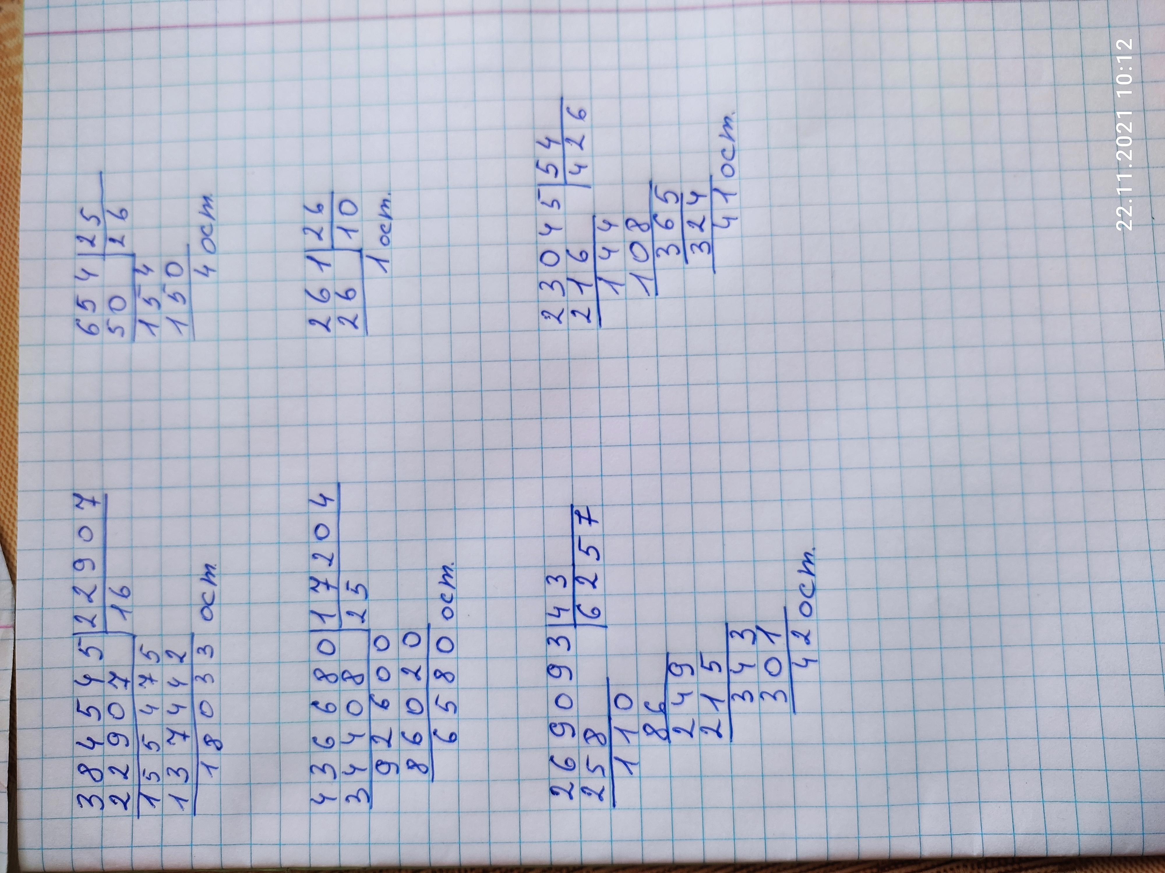 26 Выполни столбиком деление с остатком. Проверка. 384 545:22 907 654:25 436 680 : 17 204 261:26 269 093:43 23 045:54