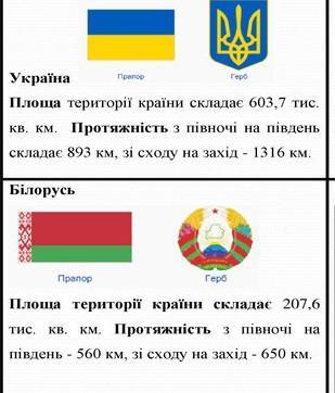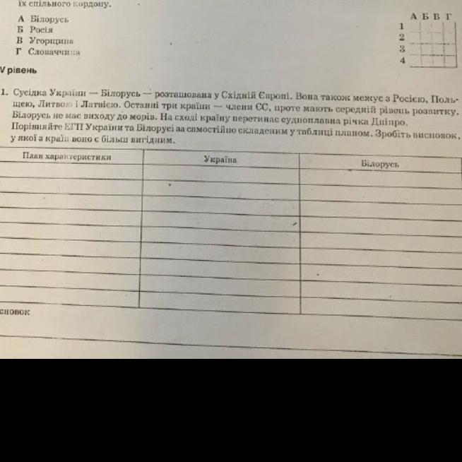 Сусідка України - Білорусь — розташована у східній Європі. Вона також межує з Росією, Польщею, Литвією і Латвією. Останні три країни — члени ЄС, проте мають середній рівень розвитку. Білорусь не має виходу до морів. На сході країну перетинає судноплавна річка Дніпро. Порівняйте ЕГП України та Білорусі за самостійно складеним у таблиці планом, зробіть висновок, у якої з країн воно є більш вигідним.