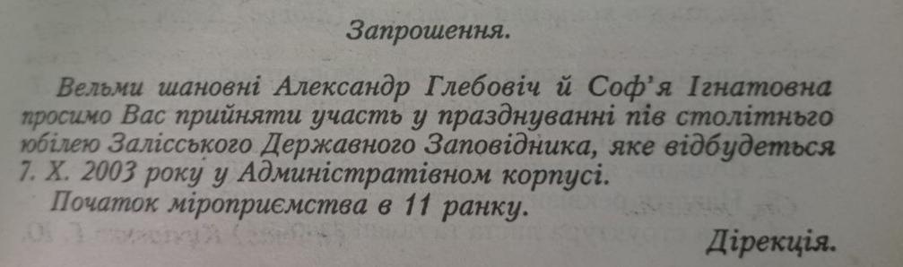 Вельми шановні, Александр Глібович й Соф'я Ігнатовна, просимо Вас прийняти участь у святкуванні ... у Адміністративному корпусі. Початок міропринмства об 11 ранку.