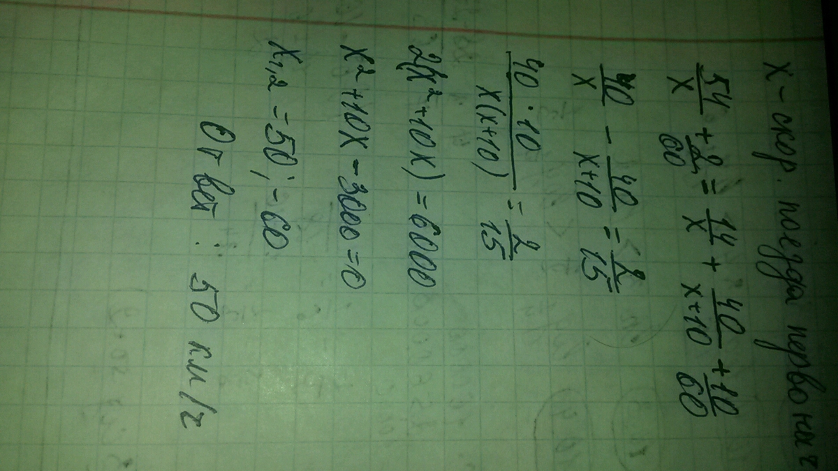 ЗАДАЧА. ПОЕЗД ДОЛЖЕН ПРОЙТИ 54 КМ.ПРОЙДЯ 14 КМ ОН БЫЛ ЗАДЕРЖАН НА 10 МИН.УВЕЛИЧИВ СКОРОСТЬ ПОСЛЕ ЭТОГО НА 10 КМ В ЧАС ОН ПРИБЫЛ НА МЕСТО НАЗНАЧЕНИЯ С ОПОЗДАНИЕМ НА 2 МИНУТЫ.ОПРЕДЕЛИТЬ ПЕРВОНАЧАЛЬНУЮ СКОРОСТЬ ПОЕЗДА.