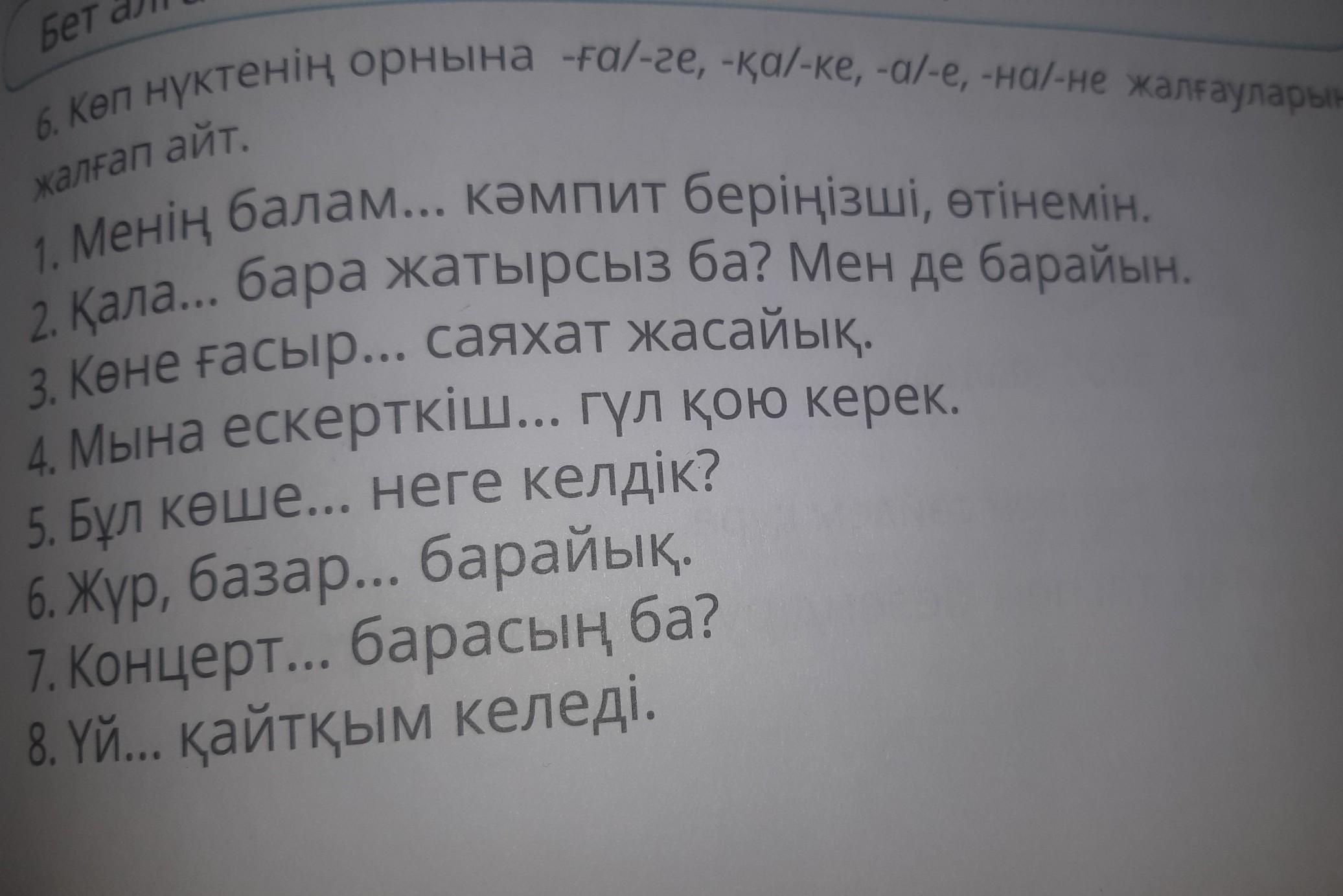6. Көп нүктенің орнына -ға/-ге, -қа/-ке, -а/-е, -на/-не жалғауларын жалғап айт ПОМОГИТЕ СРОЧНО ПОЖАЛУЙСТА!