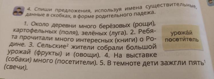 Около деревни много берёзовых рощ,картофельных полей,зелёных лугов.Ребята прочитали много интересных книг о Родине.Сельские жители собрали большой урожай фруктов и овощей.На выставке собак много посетителей.В темноте дети зажгли пять свечей.