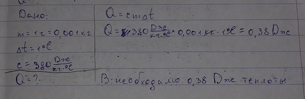 Какое количество теплоты необходимо для нагревания 200г меди на 1°c?(удельная теплоемкость меди 0,38кДж/кг К)