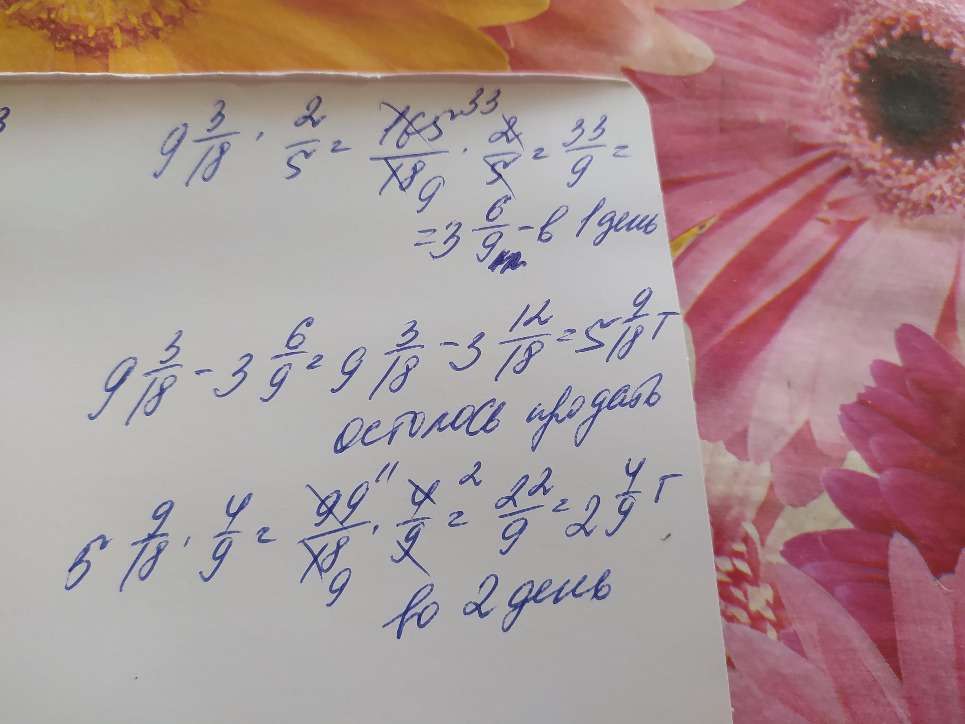 экипаж судна заморозил 9 3/18 т рыбы. в первый день заготовили 2/5 всей рыбы, а во второй 4/9 остатка. сколько тонн рыбы заморозил экипаж судна во 2 день?