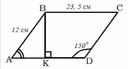 помогите, пожалуйста, найти площадь параллелограмма при том условии, что смежные стороны равны 23,5 см и 12 см. а тупой угол равен 150 градусов