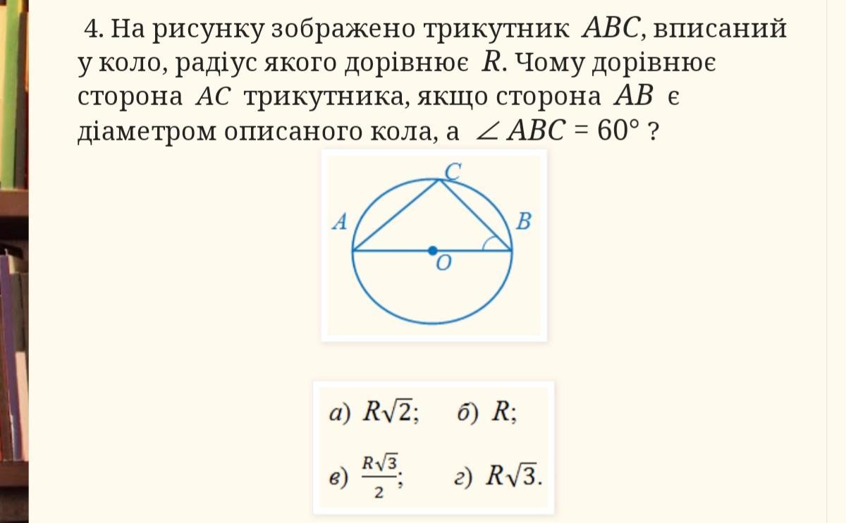 ∡А=90-60=30° ⇒ СВ=АВ/2=2R/2=R, по т. Пифагора