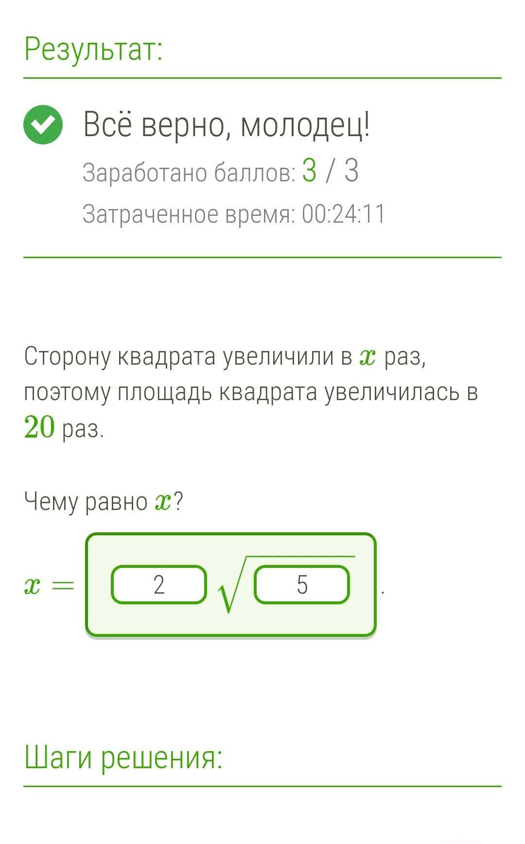 сторону квадрата увеличили в х раз поэтому площадь квадрата увеличилась в 20 раз