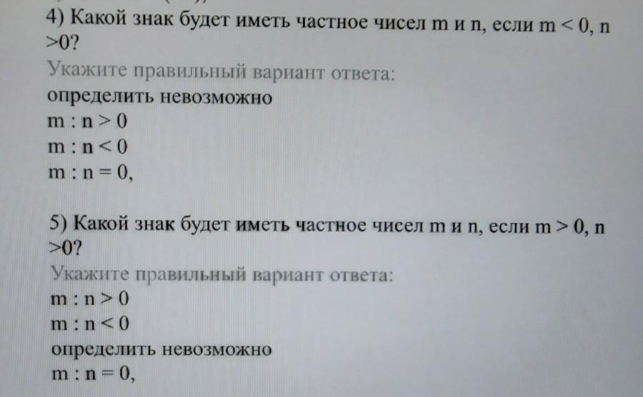 Пошаговое объяснение: возьмём вместо m и n числа -10 и 5, так как знаки разные, то и в умножении, и в делении будет знак минус, а все отрицательные числа меньше 0