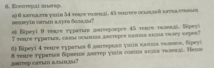 a) 6 хаткалта ушін 54 тенге төленді. 45 тенгеге осындай хаткалтанын нешеуін сатып алуга болады?