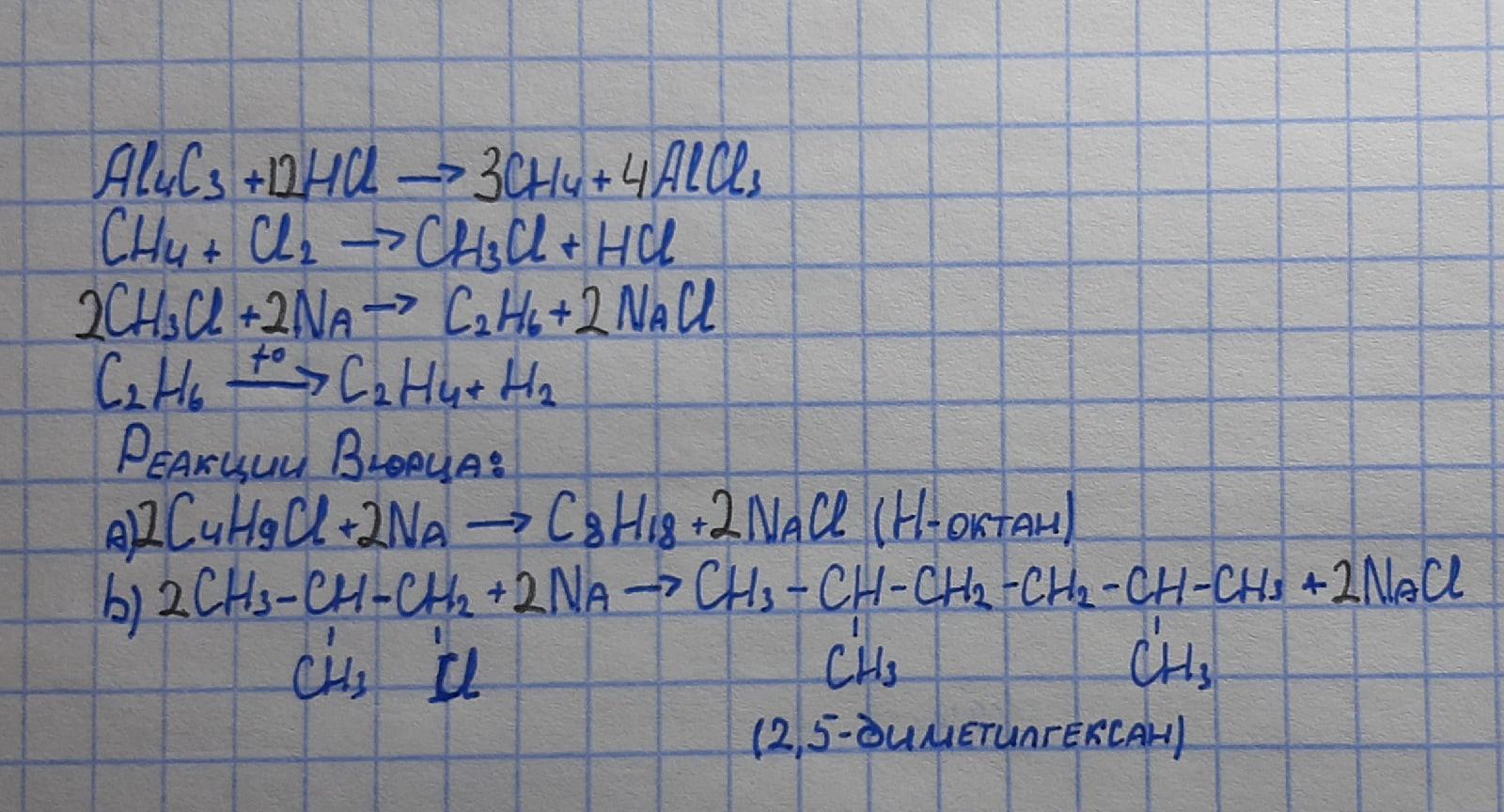 1. Осуществите превращение: AI4C3->CH4->CH3CI->C2H6->C2H4