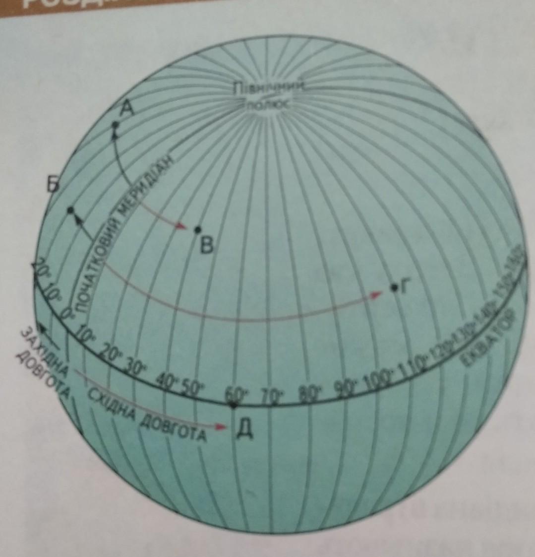 Визначте географічну довготу точок Б,В,Г,Д