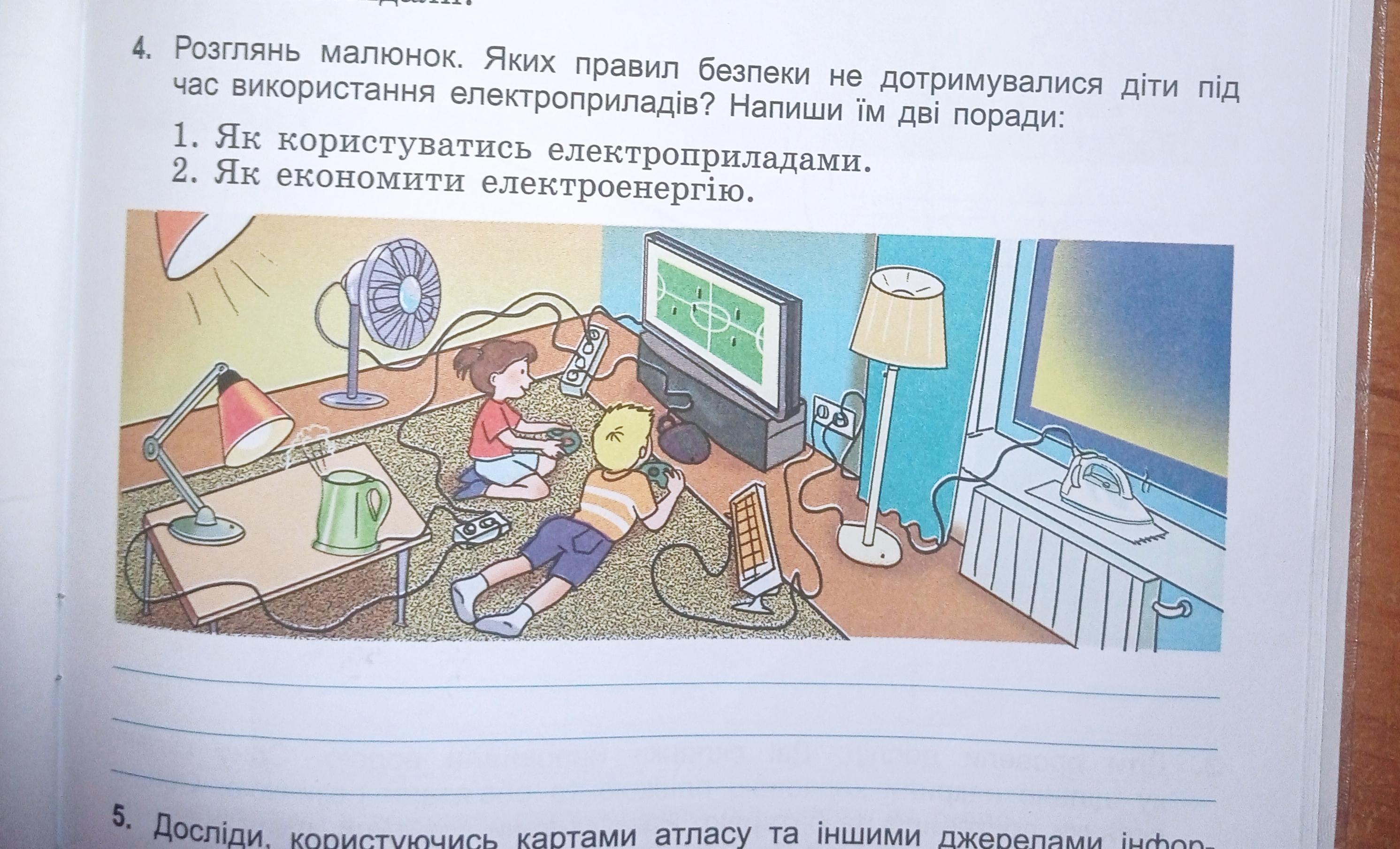 треба виключити електроні прилади ті які тобі не потрібні ми можемо сказати що на малюнку діти граються в ігри в телевізорі і всі електроні прилади включені треба їх виключити далі ,на під віконні стоїть праска яка нагріває і тканину і підвіконня і це може призвезти до пожежі так само нагрівач який нагріває пол і дітей і це також може призвести до пожежі .Запам'ятай що якщо всі електроні прилади вимкнені і вони тобі не потрібні то виключи ці прилади і ти можеш економити електроенергію.