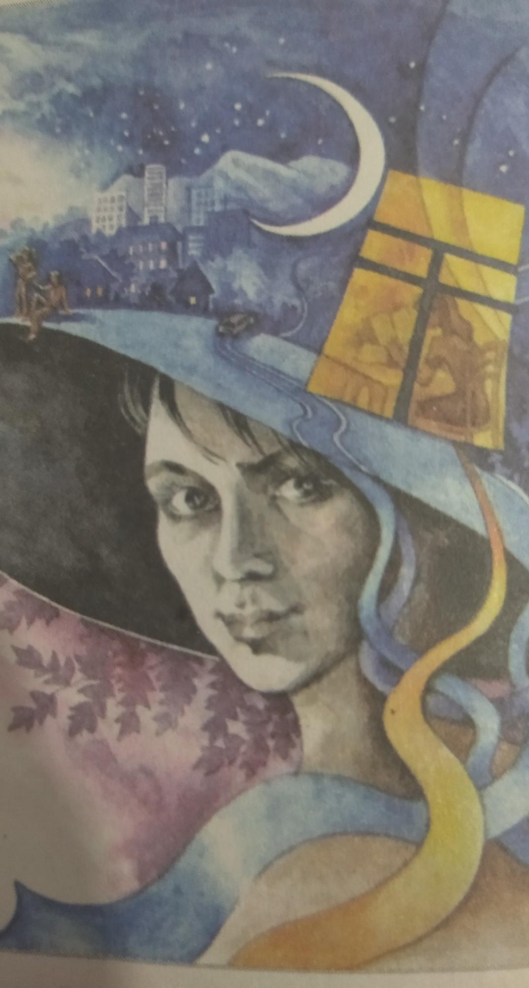 На малюнку Марини Павленко зображена чудова дівчина, у якої є чарівна шляпа. На шляпі сидять люди. НА шляпі є жовте вікно у якому видніется дівчина яка читае книгу. За вікном йде сніг, місяць вісвітлюе нічні вулці. Десь в далині іде машина. У будівлях горить світло, кожна людина займается своїми справами. Хто відпочиває, хто працює...