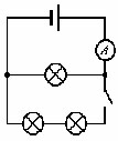 Лампы и амперметр включены так, как показано на рис. Во сколько раз отличаются показания амперметра при разомкнутом и замкнутом ключе? Сопротивления ламп одинаковы. Напряжение поддерживается постоянным.
