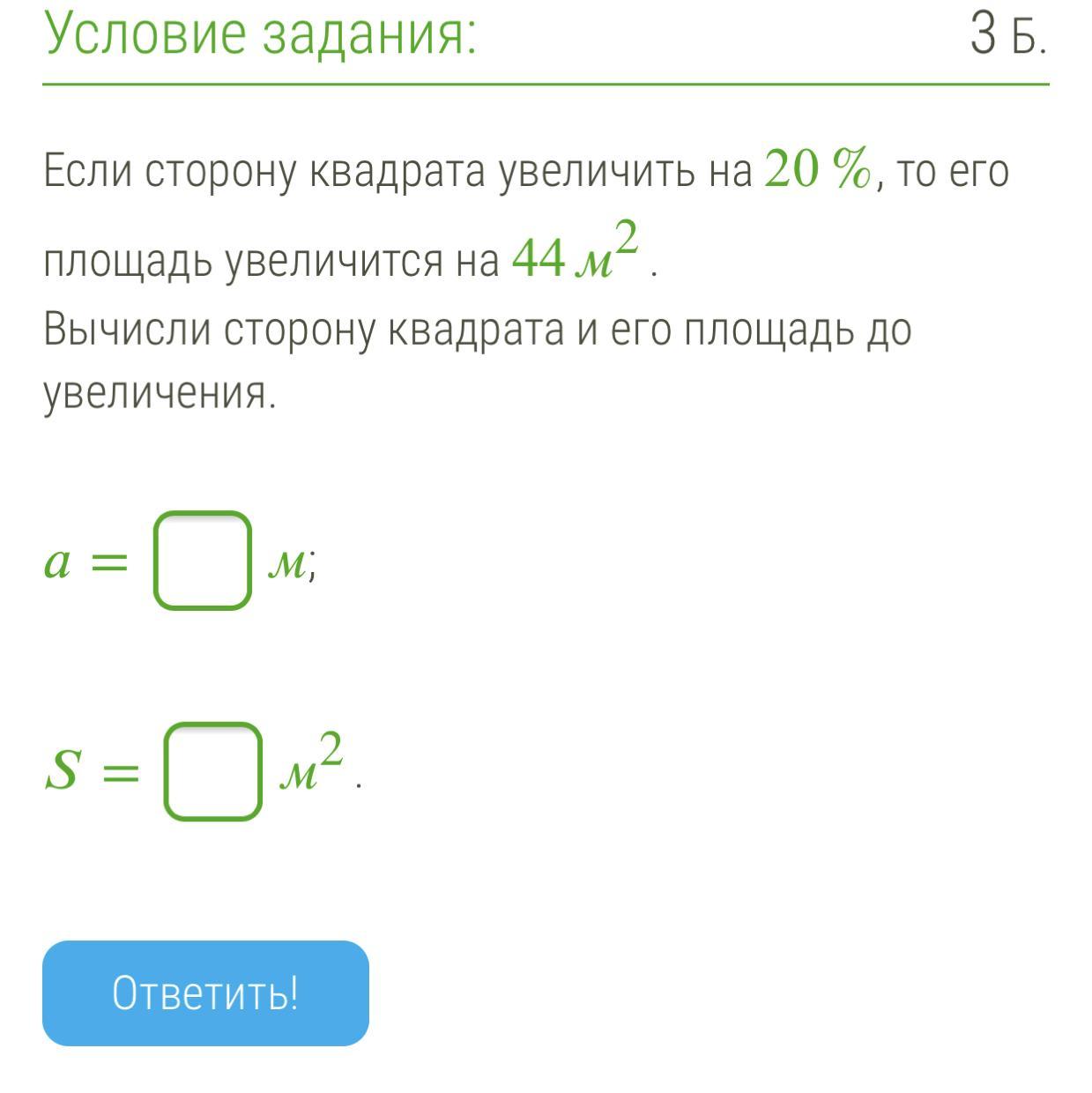 Если сторону квадрата увеличить на 20 %, то его площадь увеличится на 44 м2.